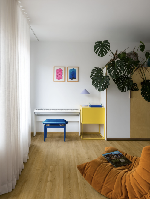 Quick-Step vertaalt de filosofie van thoughtful maximalism naar een breed aanbod aan vloeren die elk op hun manier ruimte bieden voor persoonlijke interpretatie. Zo is de klassieke, naturel eik uit de Impressive- laminaatcollectie bijzonder geschikt voor ruimtes met veel kleur, speelse prints of uitgesproken vintage-elementen.