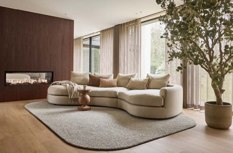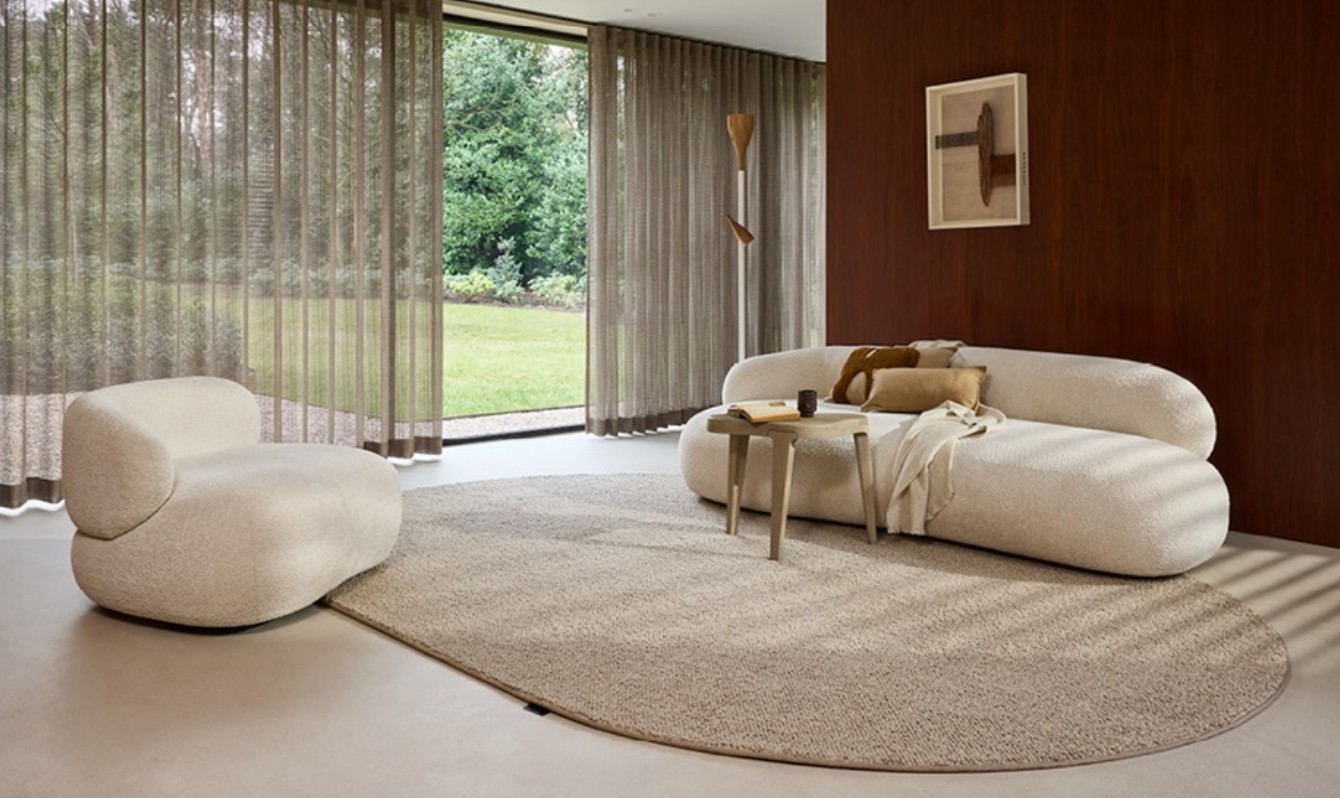 Je kunt met de DESSO Wonderful Wool II collecties een natuurlijke sfeer creëren met een vloerkleed op maat; bijvoorbeeld in een Deens Ovaal, een vorm die steeds vaker wordt gespot in de interieurs van nu. Deze vorm geeft de zitkamer een vriendelijke en robuuste uitstraling. Het effect van dit naturelkleurige vloerkleed is dat het perfect ‘blend’ met de minimalistische natuurstenen vloer. De totale interieursfeer wordt zo warm en comfortabel.