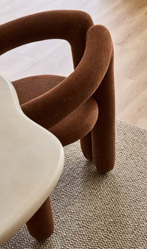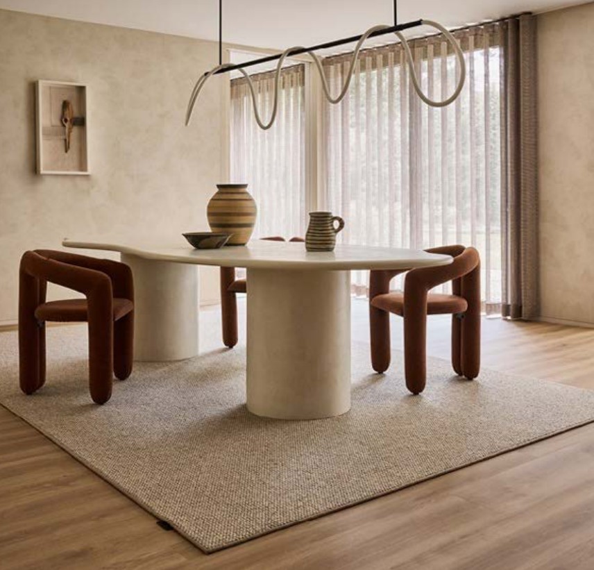 In de nieuwste woontrends draait alles om sfeer en persoonlijkheid. Natuurlijke materialen en structuren brengen de natuur naar binnen en zorgen voor een prettig, warm gevoel in huis. Een houten vloer met daarop een wollen vloerkleed is dé combinatie voor extra comfort en sfeer. Ook in de eetkamer is een royaal vloerkleed uit een van de DESSO Wonderful Wool II collecties ideaal: het is stijlvol, comfortabel én maakt samen eten nog gezelliger. De bouclé structuur van de DESSO Liszt collectie sluit naadloos aan bij het nieuwe landelijk-moderne interieur met een ‘quiet luxury’ karakter.