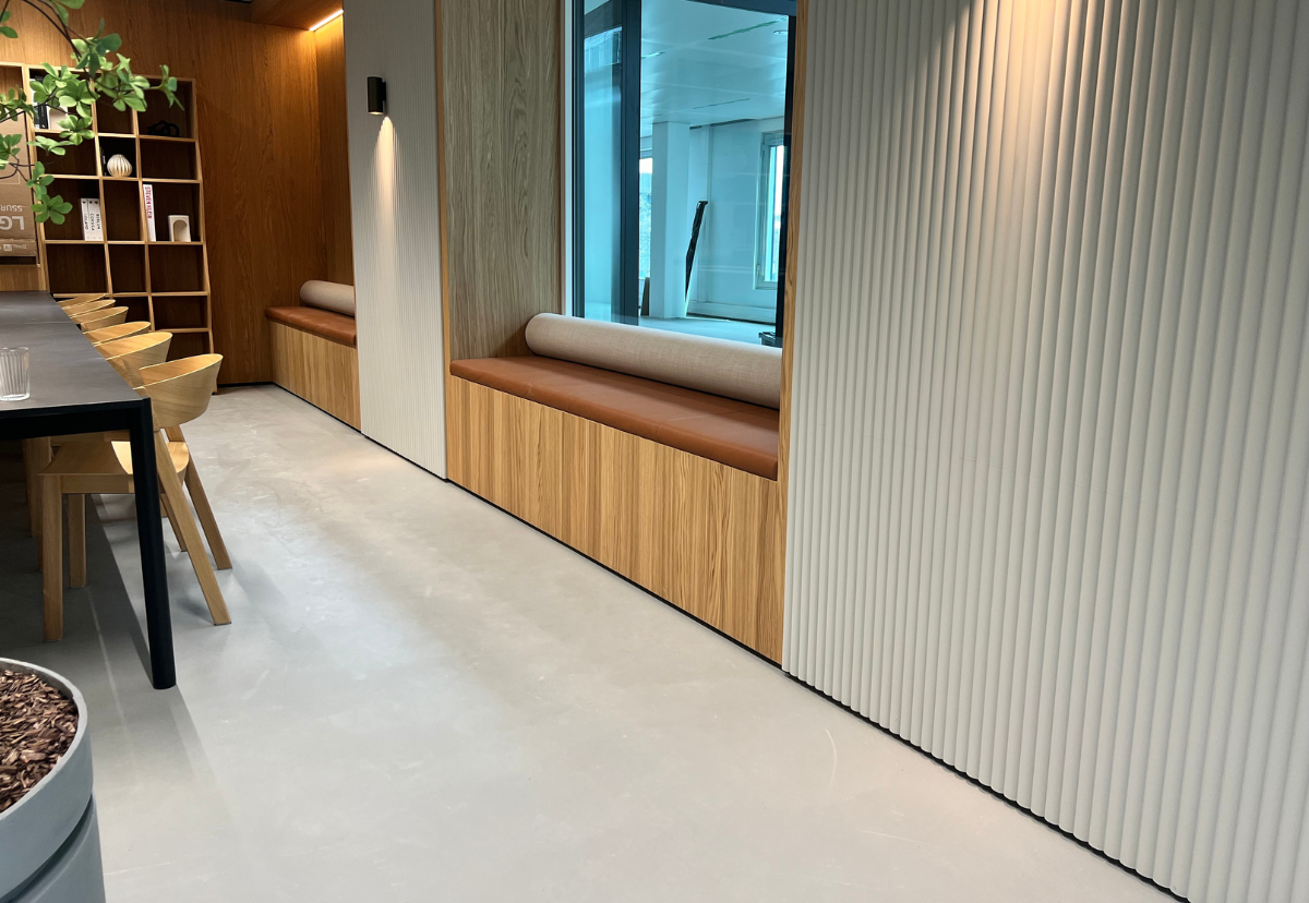 woonbeton is perfect voor in elke kantoorpand. Het naadloze design van de vloer verbind de verschillende functies van elke ruimte met elkaar tot één kantoor.