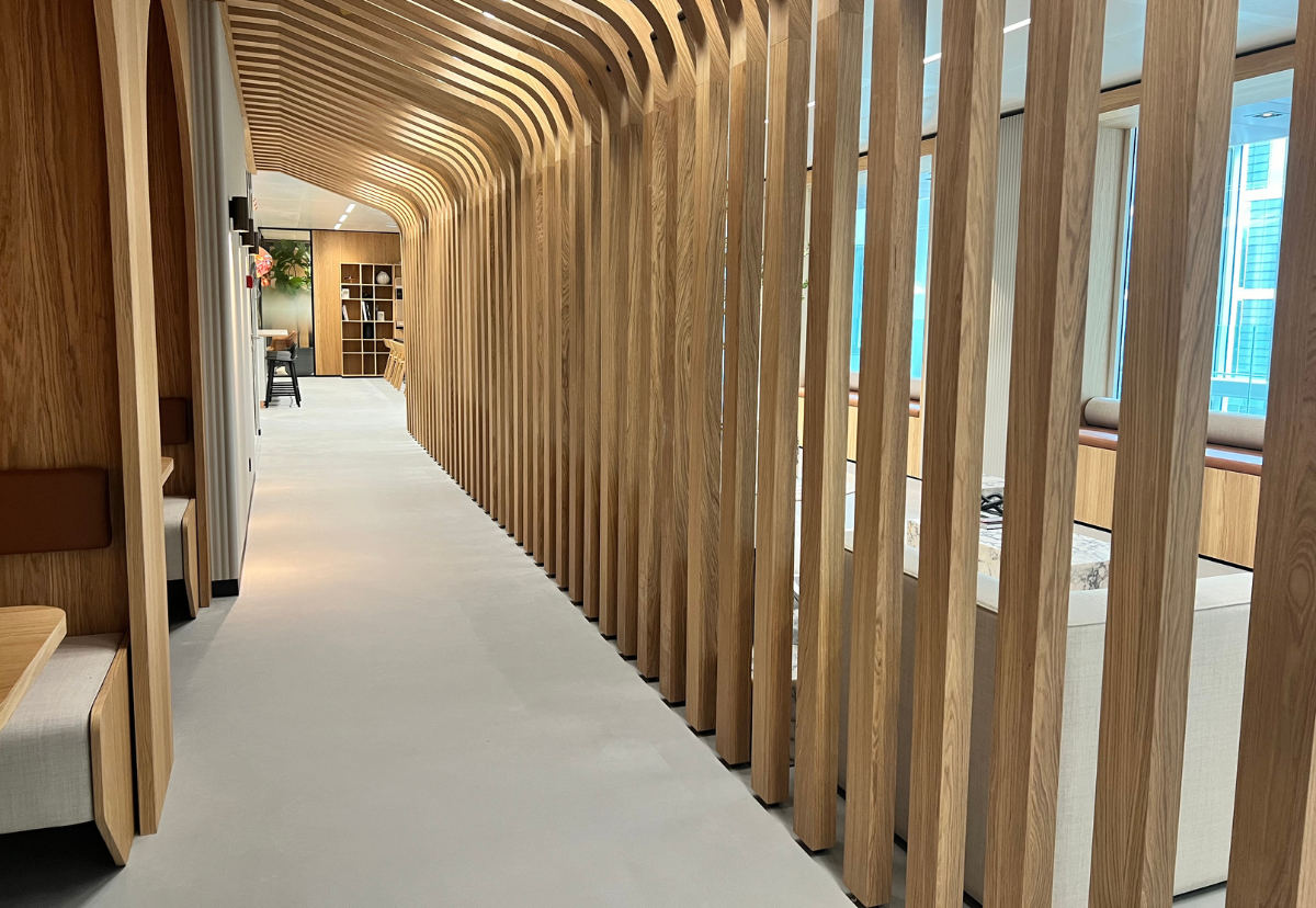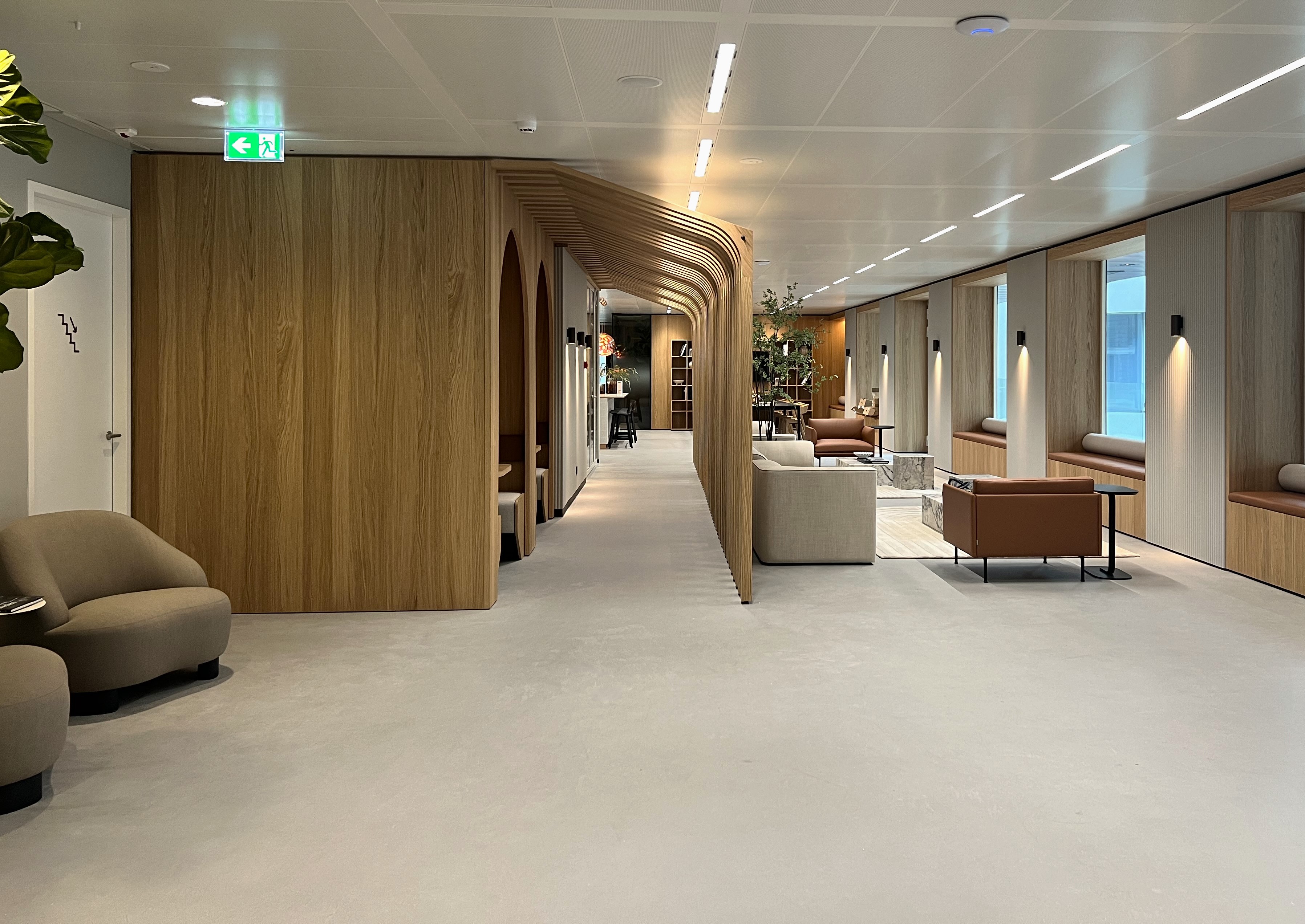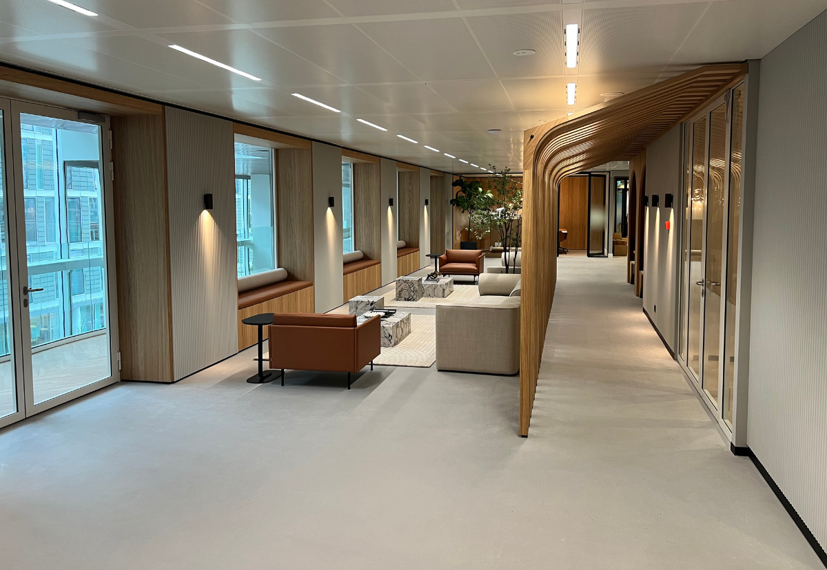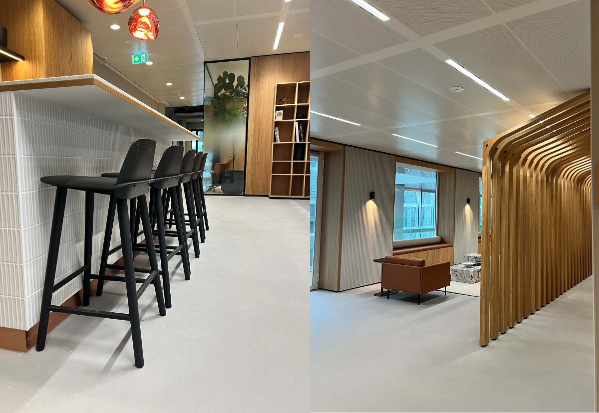 Bij dit project in een high end kantoorpand in Amsterdam staat maatwerk centraal. Dankzij About Projects en interieur ontwerp van Maison Libre is dit kantoor een fantastische werkomgeving geworden. Onze Motion Concrete Quartz verbind alle kantoren, vergaderzruimtes, toiletten en de keuken met elkaar, dankzij het naadloze design. De gekozen kleur is Burj Khalifa, deze warme tint is perfect te combineren met al het houten maatwerk bij de entree en de keuken.