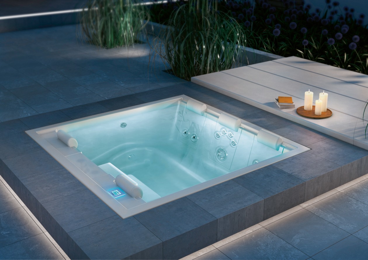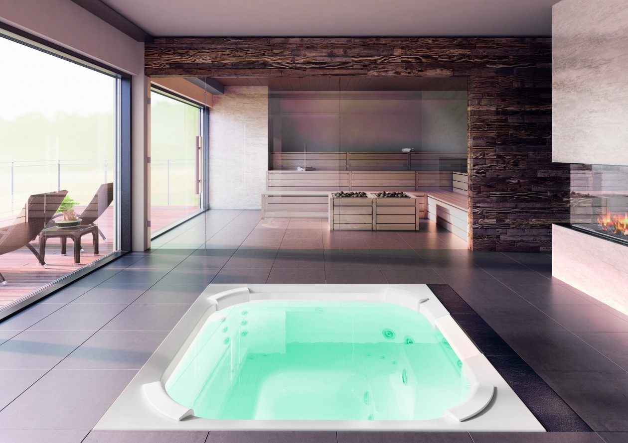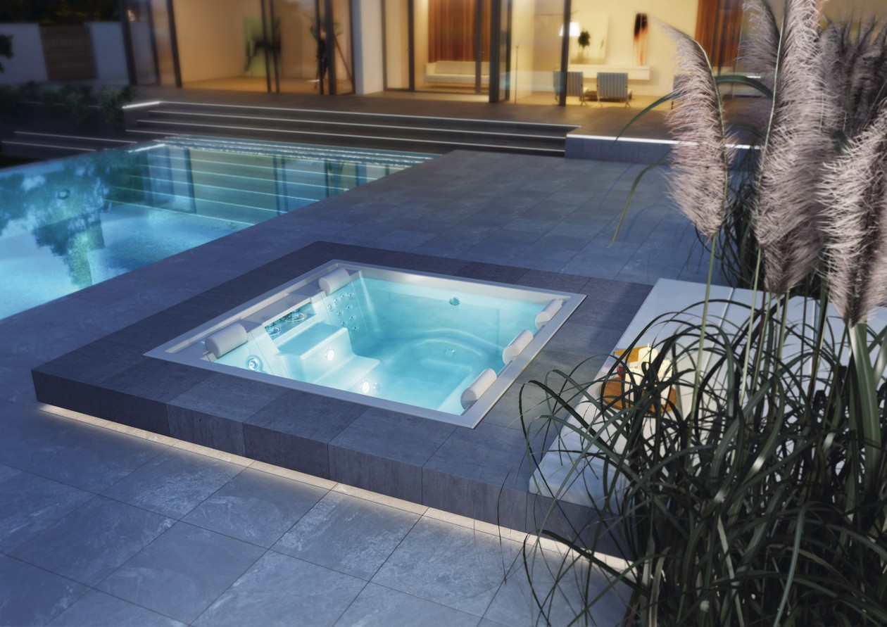 Modern, rechtlijnig en passend in elke omgeving. De vier zitplaatsen zijn in de hoeken verwerkt – in een diagonale zitpositie. Hierdoor hebben vier personen veel bewegingsruimte. De comfortabele nekkussens en een uitvoerige uitrusting aan massage- en luchtjets zorgen ervoor dat je heerlijk kan ontspannen.