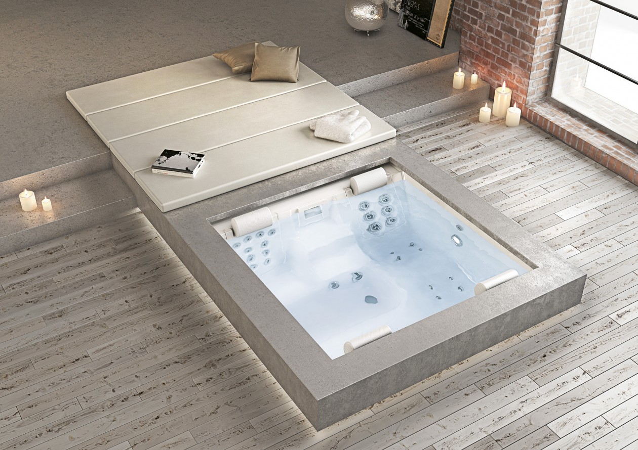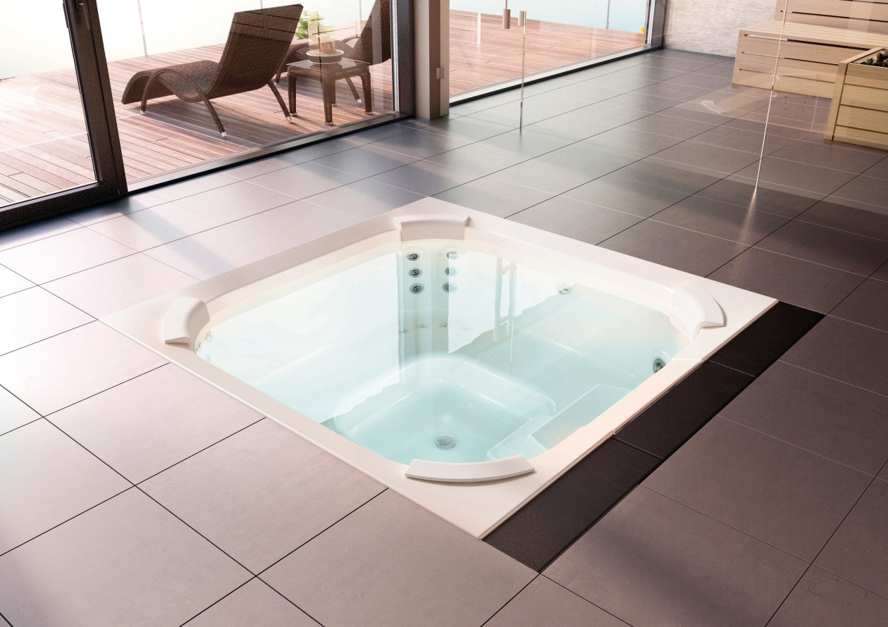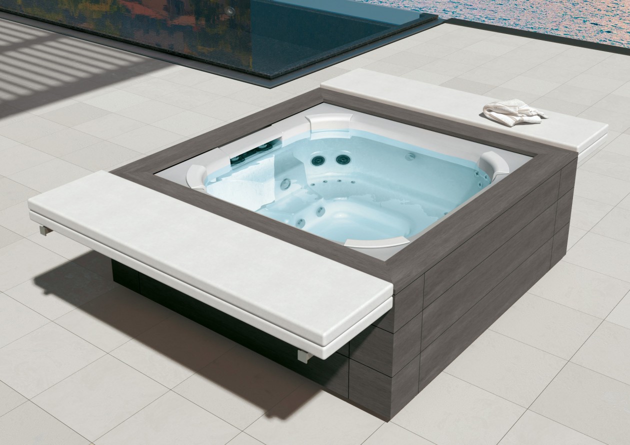Modern, rechtlijnig en passend in elke omgeving. De vier zitplaatsen zijn in de hoeken verwerkt – in een diagonale zitpositie. Hierdoor hebben vier personen veel bewegingsruimte. De comfortabele nekkussens en een uitvoerige uitrusting aan massage- en luchtjets zorgen ervoor dat je heerlijk kan ontspannen.