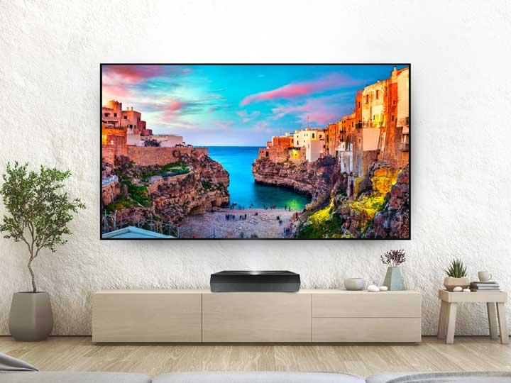 Een projector die je op een tv-meubel zet en die meteen projecteert op de muur. Groot beeld op korte afstand. Gemakkelijk te installeren. Het beeld is tussen 85 en 120 inch (190 tot 260 cm breed). Er zit een mediaspeler in zodat je gebruik kunt maken van populaire streamingdiensten zoals Netflix. De ingebouwde conventionele speakers geven kwaliteitsgeluid. Het systeem is voor gebruik in de huiskamer, in de thuisbioscoop, slaapkamer, op kantoor, of om op verschillende locaties te gebruiken.