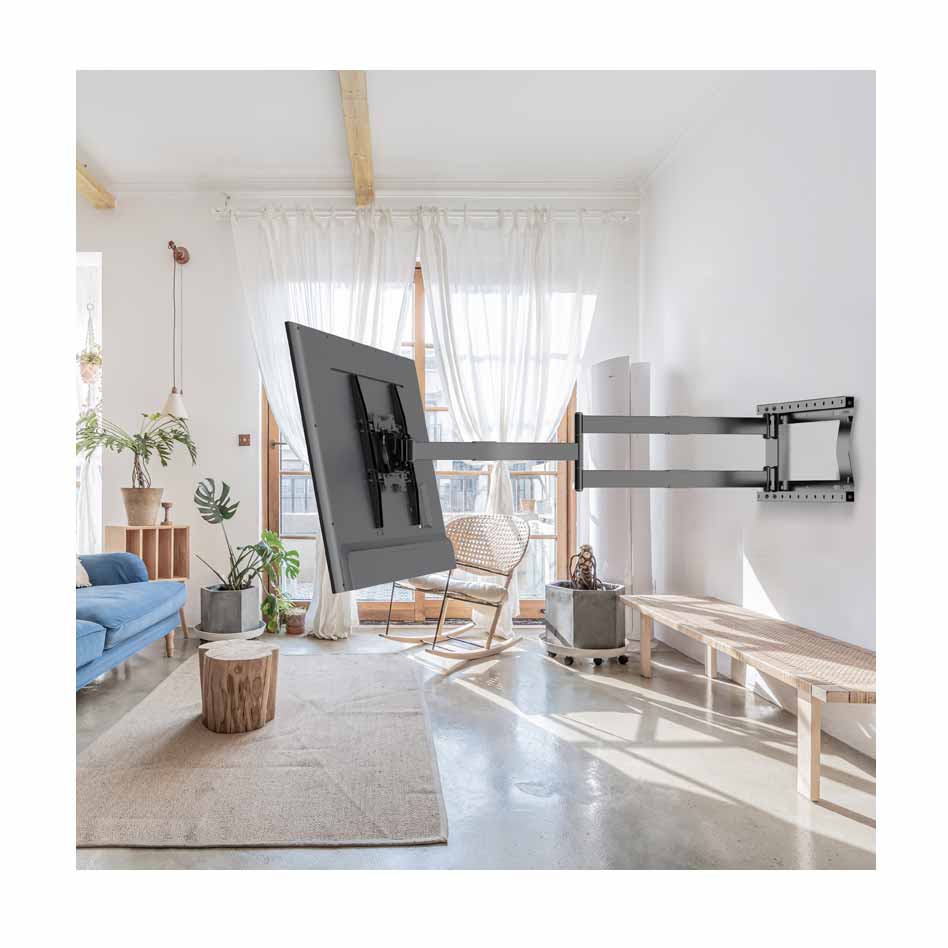 Uniek in zijn soort is de extra lange, draai en kantelbare tv-beugel voor aan de muur. De televisie is met deze beugel maar liefst 120 cm van de muur te positioneren en hiermee de langste beugel ter wereld op dit moment. Naast de uitzonderlijke lengte valt deze beugel ook op door zijn flexibiliteit. De beugel is variabel instelbaar middels drie draaipunten en de rotatie- en kantelfunctie, waarmee de kijkpositie altijd gemakkelijk op de gewenste manier kan worden ingesteld. Deze tv-beugel met extra groot bereik is geschikt voor bijna alle televisies. Met een maximale VESA-maat van 400x400 mm en een enorm draagvermogen blijft hij uiterst stabiel. De beugel bevat verder een kabeldoorvoer, waarmee de kabels netjes weg te werken zijn voor een opgeruimd beeld.