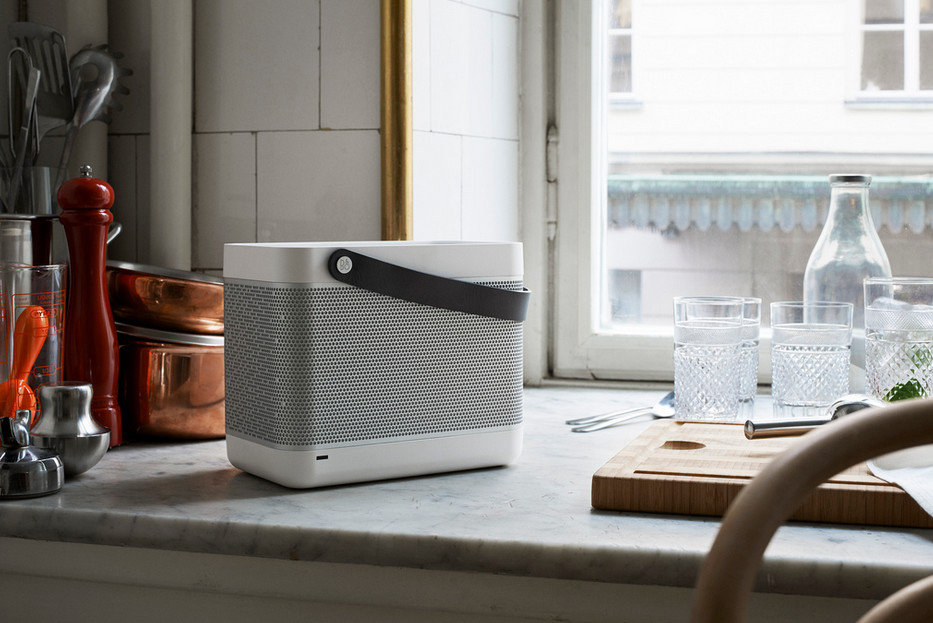 De nieuwe variant van de Beolit 12 heeft een witte kast, een rooster van natuurlijk aluminium en een zwarte, natuurlijk leren draagband die perfect in contrast staat met de rest van de lichte kleuren.