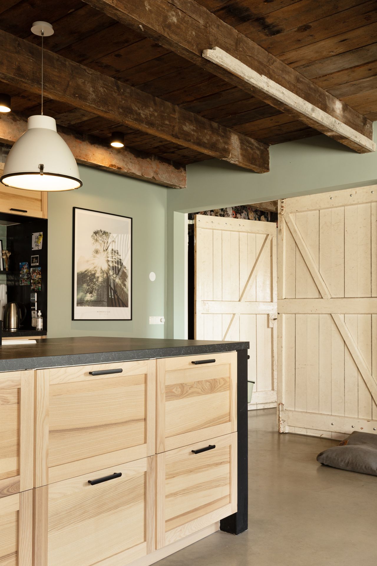 Voor deze oude boerderij, in de polder, is er gekozen voor een gevlinderde betonvloer in de kleur 50% basisgrijs en 50% zandkleur. De keuken is gemaakt in de oude koeienstal, de deuren en het originele plafond zijn hiervan nog zichtbaar! Deze warme beton kleur komt in combinatie met de houten keuken goed tot zijn recht!