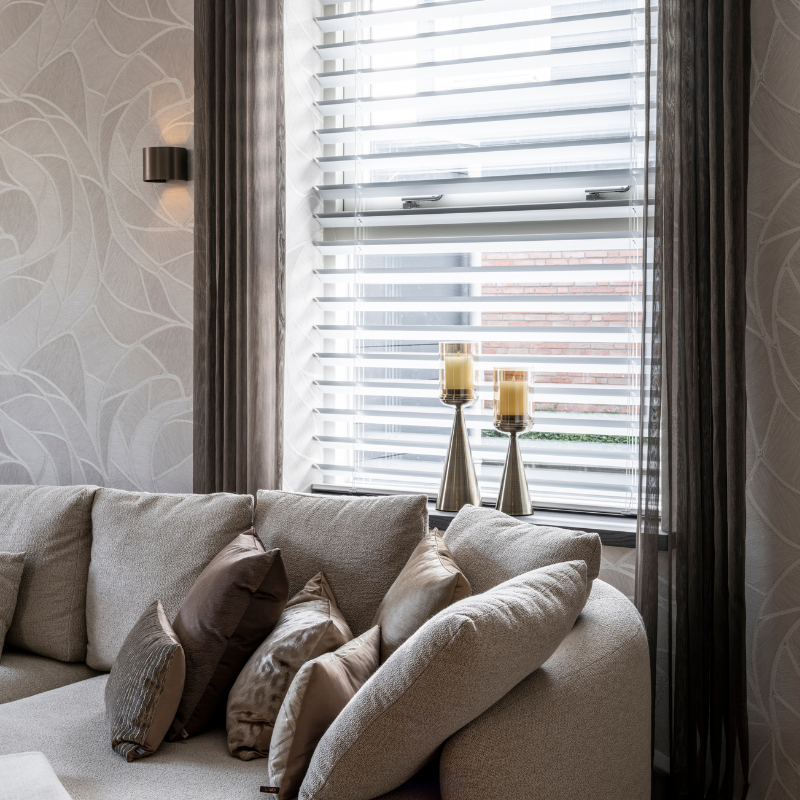 In dit moderne interieur zijn de Megaview® jaloezieën toegepast samen met in-between gordijnen. De combinatie geeft het raam meer body en creëert een warme uitstraling. Ook zorgen de producten samen voor meer privacy. Zo kun je de lamellen volledig open zetten voor veel lichtinval, maar is er toch privacy door de in-between gordijnen. Een evenwichtige combinatie met een luxueus resultaat.