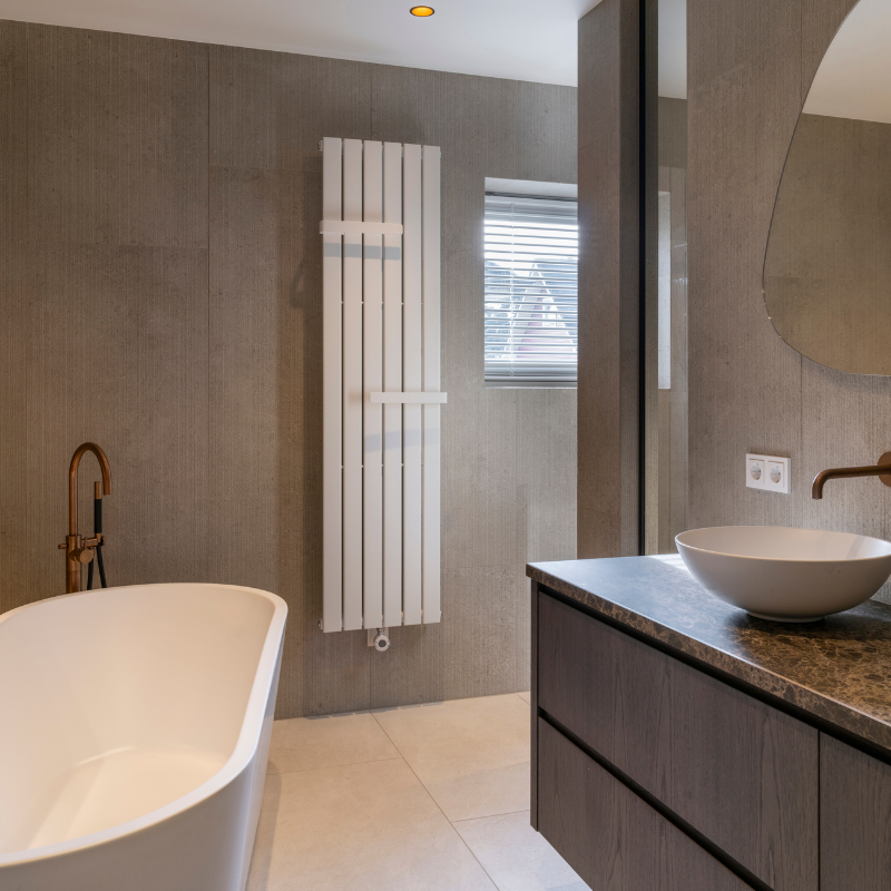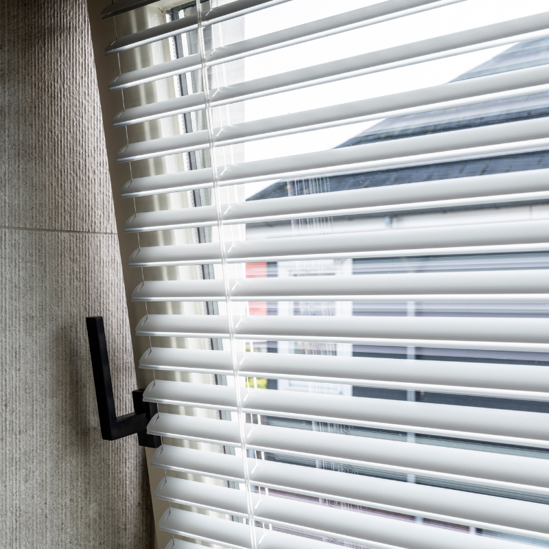 Niet alleen zijn de woonkamer en de keuken voorzien van Megaview® jaloezieën, maar ook de badkamer en de slaapkamer. De badkamer is voorzien van een draai-kiepraam waar de aluminium jaloezieën de inkijk beperken. Bij een draai-kiepraam wordt de raambekleding op het kozijn bevestigd, waardoor deze mee beweegt zodra het raam opengaat. In dit geval is het product voorzien van zijgeleiding om klapperen te voorkomen.