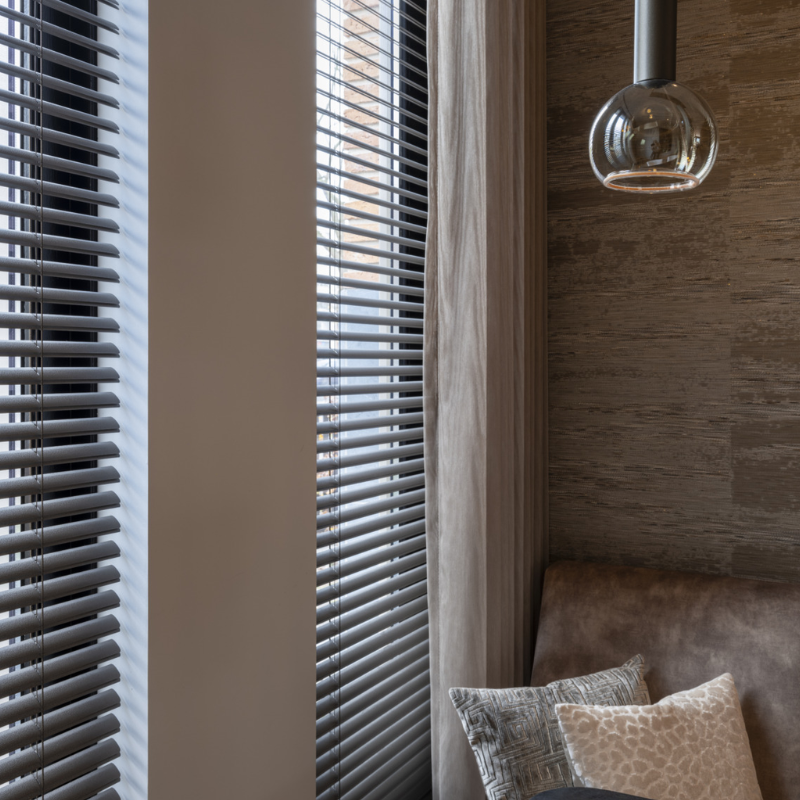 Vaak worden jaloezieën in de kleur zwart, taupe of wit geplaatst. De bewoners van deze exclusieve woning kozen voor de unieke bronzen aluminium jaloezieën. De lamellen zijn voorzien van een textuur, waardoor er een robuustere look ontstaat. De kleur brons past bij vrijwel elke interieurstijl, of je nu kiest voor klassiek, industrieel of zoals hier, een hotel chique interieur.