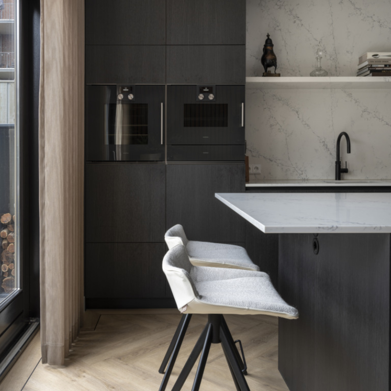 De keuken wordt vaak gezien als de gezinshub in huis, een plek waar je samenkomt. Dit interieur bevat alle elementen voor een fijne sfeer. De grote bank leent zich voor gezelschap en ruimte. Waarbij de bronzen jaloezieën gecombineerd met de overgordijnen een echte binnenkomer zijn. Ze filteren het daglicht en creëren privacy. Het behang kleurt volledig in de ruimte met de aardse tinten.