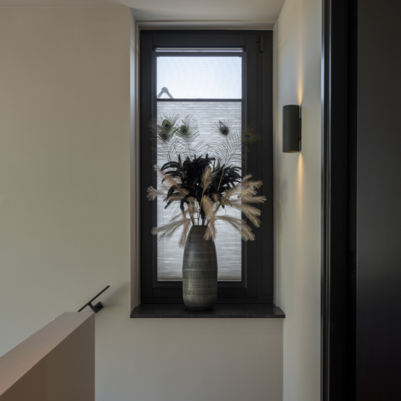 Aan de voorkant van de woning vind je de imposante gevelkade. Deze is voorzien van een mooie, hoge raampartij met Duette®. Om deze eenvoudig te bedienen is er gekozen voor slimme raamdecoratie. Vanaf je luie stoel open je de app en bedien je de Duette® Shades super handig elektrisch.