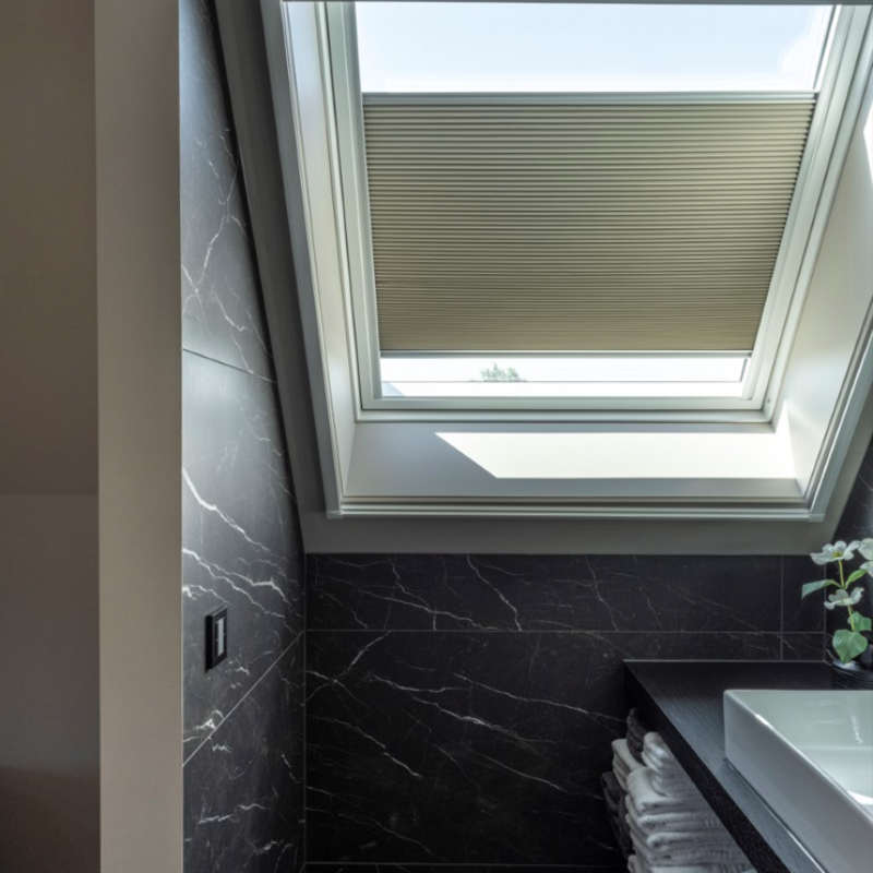 Op de bovenverdieping is er voor verduisterende Duette® gekozen, zodat er extra privacy is. Deze zijn gemonteerd bij de draai-kiep- en dakramen. Via het Perfect Fit systeem kan het draai-kiepraam nog steeds open en beweegt de raambekleding mee. Bij de montage op het dakraam wordt vaak gekozen voor zijgeleiding zodat er minder lichtkieren zijn.