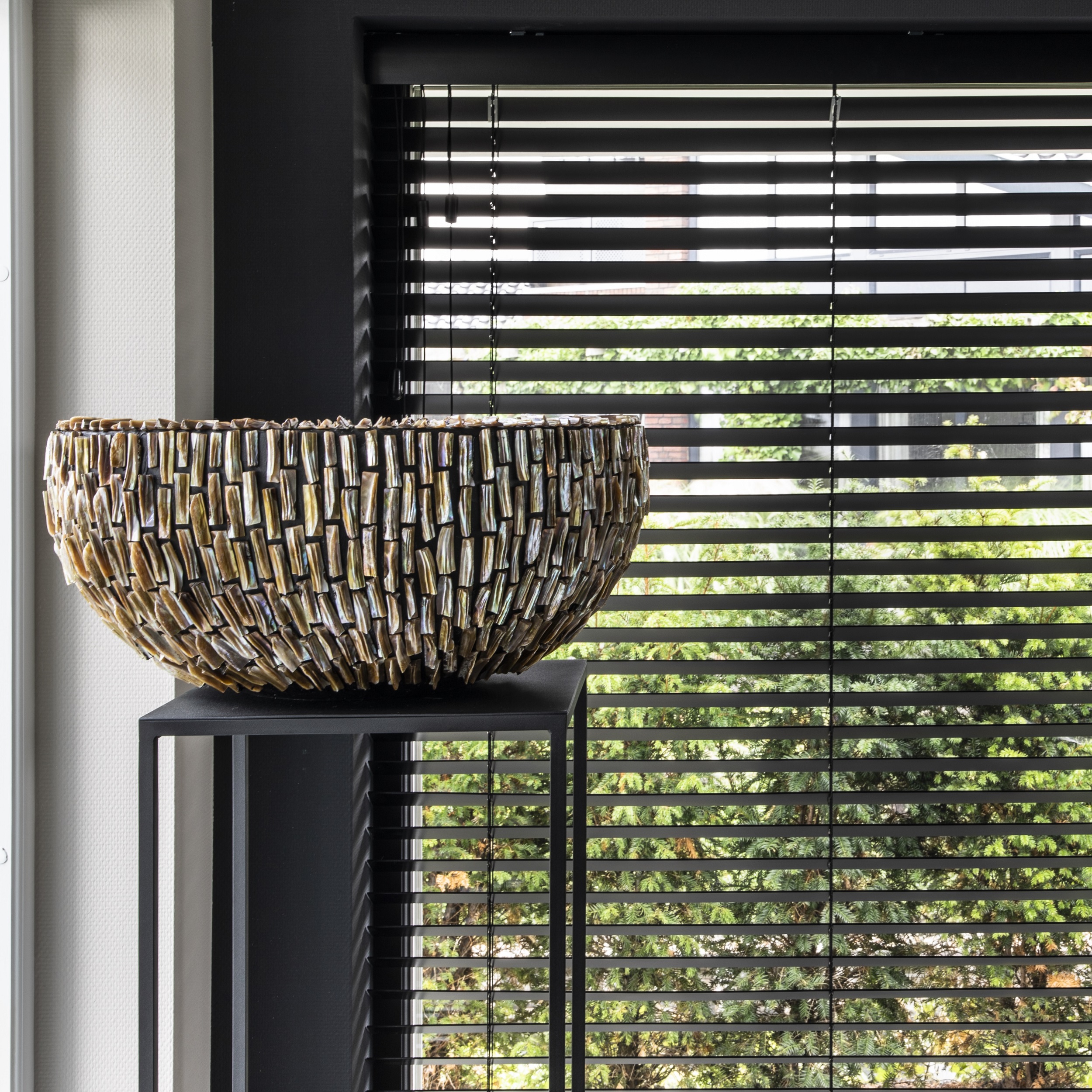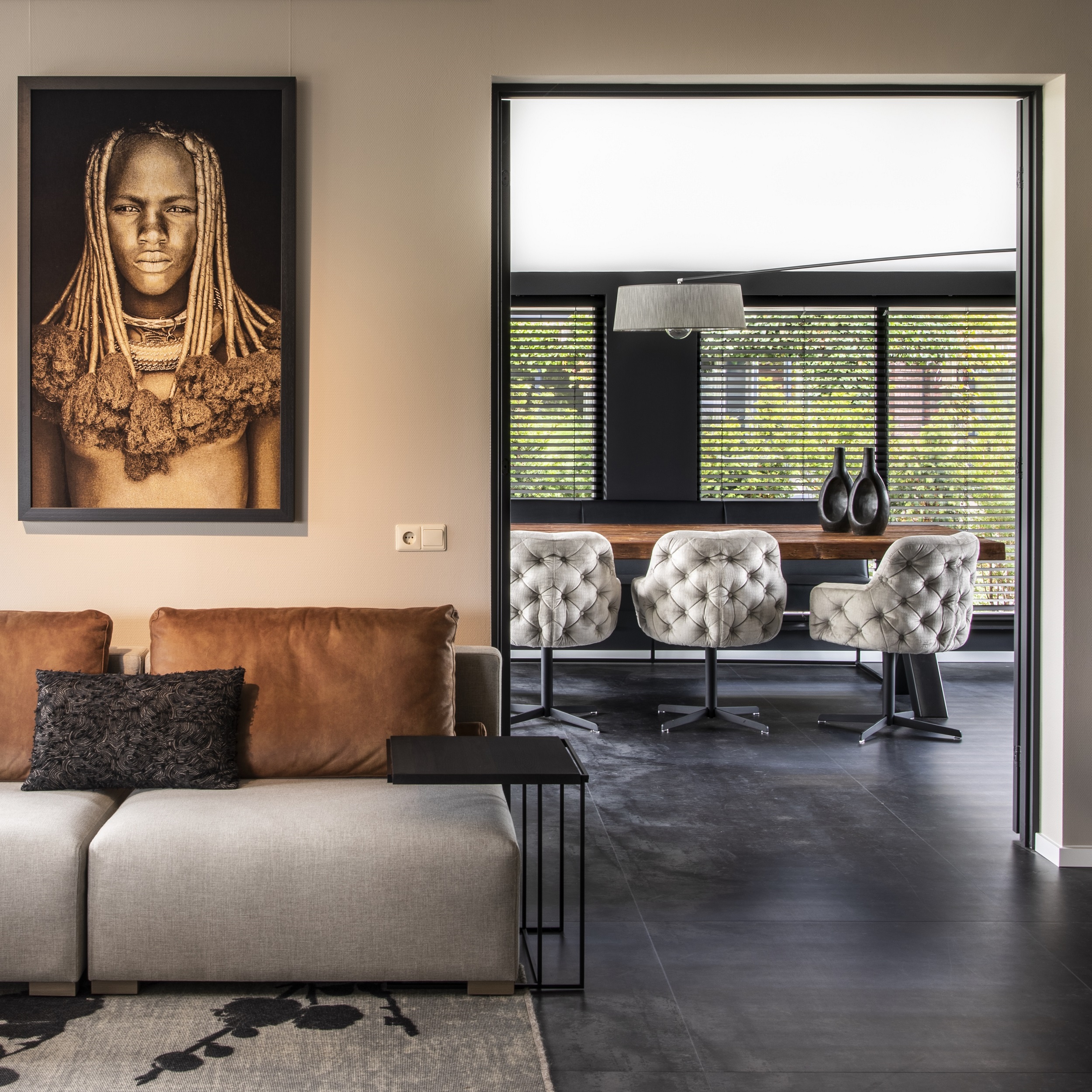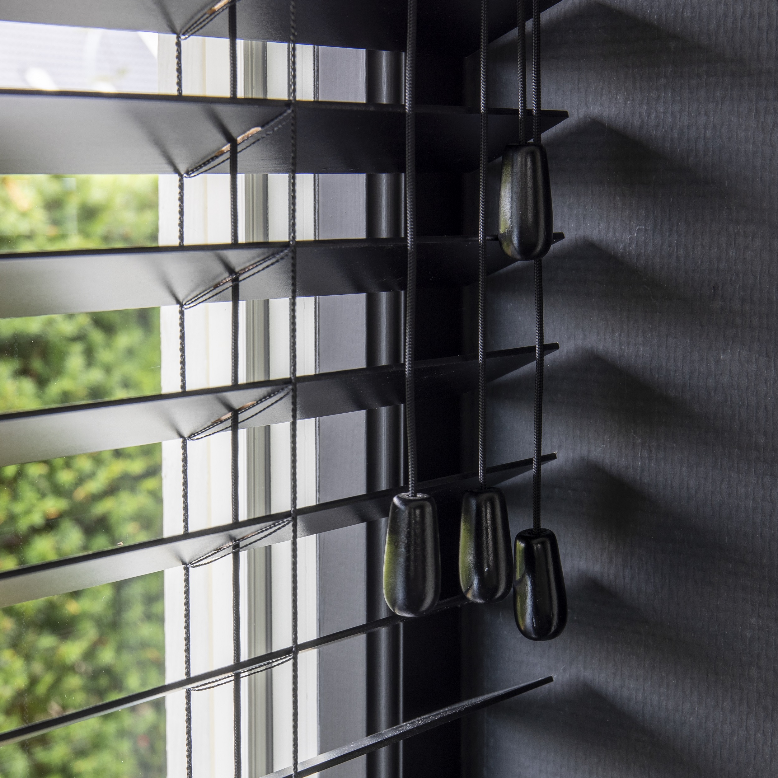 Door de kleur van de muur door te trekken in de raamdecoratie ontstaat er een geheel. Een stoere keuze om voor zwart te gaan. Bovendien kun je met jaloezieën spelen met het licht en creëer je een mooie schaduw op wand of vloer. ‘’We hebben veel licht in huis en daarom heeft onze keuze voor zwarte jaloezieën super uitgepakt. We zijn blij met het eindresultaat.’’ Bij de zwarte muur is gekozen voor de 50 mm houten jaloezieën met kleurnummer 8790. De witte 50 mm houten jaloezieën (kleurnummer 8748) hangen voor de trapezium ramen.
