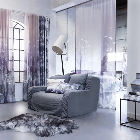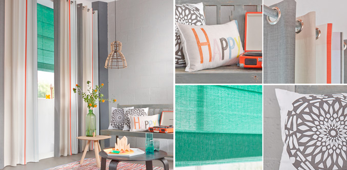 Dubbele raambekleding is nog mooier dan een enkel gordijn’, vertelt Mascha. ‘Een combinatie van hoge gordijnen met een vouwgordijn in een andere tint is prachtig. Ook in de Happy Colors trend is een vouwgordijn met een gordijn goed te combineren. Deze combinatie is namelijk ideaal voor ruimtes die moeilijk huiselijk te maken zijn zoals hele hoge of hele grote kamers. Maar ook in minder grote woningen kan dubbele raambekleding een must zijn, bijvoorbeeld om inkijk te voorkomen of bij een minder mooi uitzicht. Van Happy Colors gordijnen word je echt blij! Het gestreepte gordijn (Nuevo 6) krijgt een nog frissere uitstraling door de combinatie met het smaragdgroene vouwgordijn (Donna 42). De kussens HAPPY COLOUR en kussen BUTTON geven de finishing touch in deze trend.