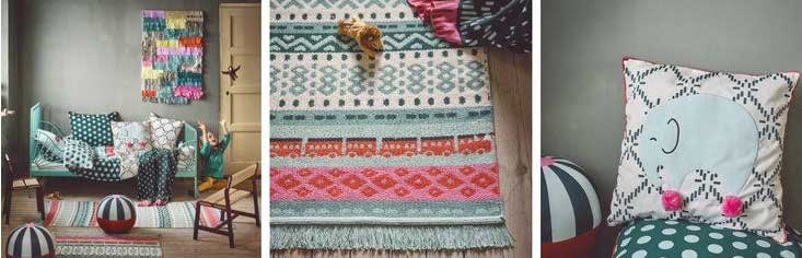 De patronen op het KÄPPHÄST kindertextiel zijn geïnspireerd op de vrolijke kleuren van lovikkavantar - de traditionele handschoenen uit de Zweedse Lovikka regio. Kinderen dromen weg onder beddengoed met prints van treinen, fietsen en beren. Spelen kan op het vloerkleed met prints in groen, rood, roze en geel. Uitrusten kan op het kussen met lichtblauwe olifant.