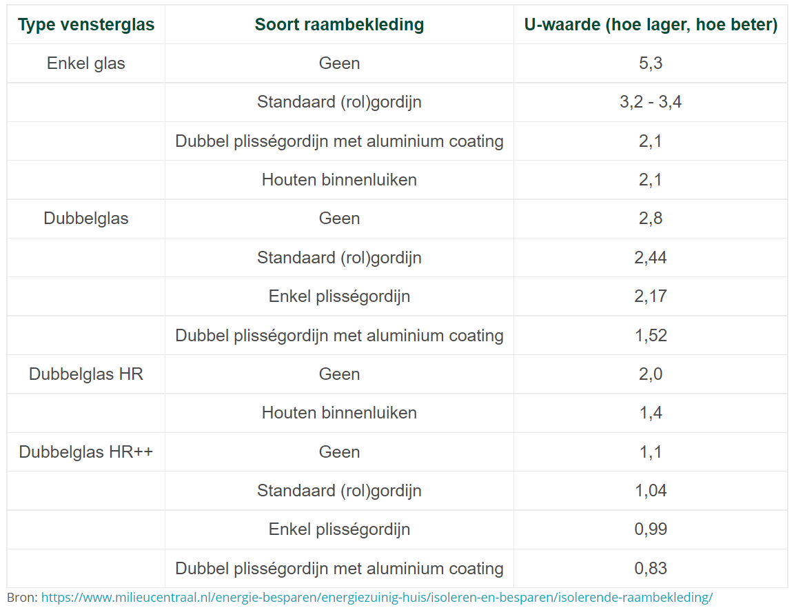 Wil je voornamelijk isoleren en toch nog wat licht binnenlaten, waarbij je in de zomer de warmte buiten en in de winter binnen wil houden, dan zijn honingraat plissé gordijnen een prima optie. Plissé gordijnen en vooral de HEWO honingraat plissé gordijnen met aluminium coating aan de binnenzijde hebben zelfs de beste isolatiewaarde van alle raamdecoratie zoals ook te zien is in de bijgaande tabel van Milieucentraal.nl.