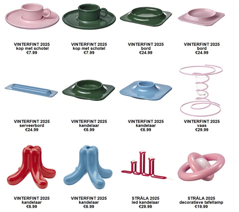 IKEA en de Zweedse ontwerper Gustaf Westman slaan de handen ineen voor de nieuwe limited VINTERFINT feestdagencollectie. Met ontwerpen in gedurfde kleuren en opvallende vormen dekt hij de tafel dit winterseizoen extra feestelijk en geeft hij een eigen draai aan traditionele tafelmomenten. Het resultaat: vernieuwende tafelaccessoires voor de VINTERFINT collectie en twee lampen voor STRÅLA, de verlichtingscollectie voor de feestdagen. Alle producten hebben uitgesproken kleuren, zoals pastelroze, lichtblauw, donkergroen en knalrood. De producten met organische vormen en herkenbare Westman-signatuur zijn echte blikvangers en tegelijkertijd toegankelijk voor iedere interieurliefhebber. De nieuwe VINTERFINT collectie is vanaf 1 oktober verkrijgbaar in de winkels.