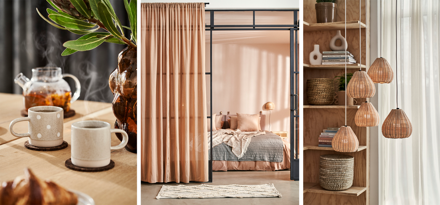 Breng harmonie in het interieur. Combineer zachte kleuren en textiel met riet en keramiek om het karakter van een kamer uit te dagen en samen te brengen.