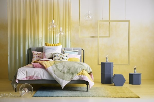 De zon laat zich weer zien en de dagen worden langer. De nieuwste woonaccessoires van IKEA zijn geïnspireerd door het licht en geven je huis een flinke dosis positiviteit. De kleuren van het HOTELLRUM vloerkleed vloeien over van warmgeel naar petrolblauw, alsof de zon ondergaat in de zee. Kruip onder het OLYMPTISTEL dekbedovertrek, dat bedrukt is met een print van kleurrijke inktdruppels. Laat je de volgende morgen zachtjes wekken door de ochtendzon met de GLÄSORT gordijnen die subtiel licht laten doorschijnen. De speelse BILD poster brengt je terug naar je jeugd en toont glinsterende knikkers in een spel van kleur en lichtreflecties van de zon.