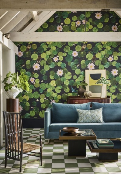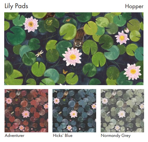 Het dessin ‘Lily Pads’ toont grafische leliebladeren, afgewisseld met waterlelies. Daartussen openbaart zich een levendige wereld van libellen, otters, ijsvogels, vlinders en kleine schaatsenrijders. ‘Lily Pads’ is een uitbundige ode aan de inheemse Britse flora en fauna.