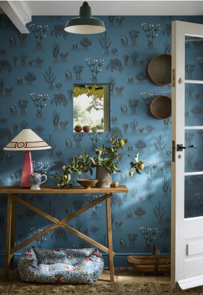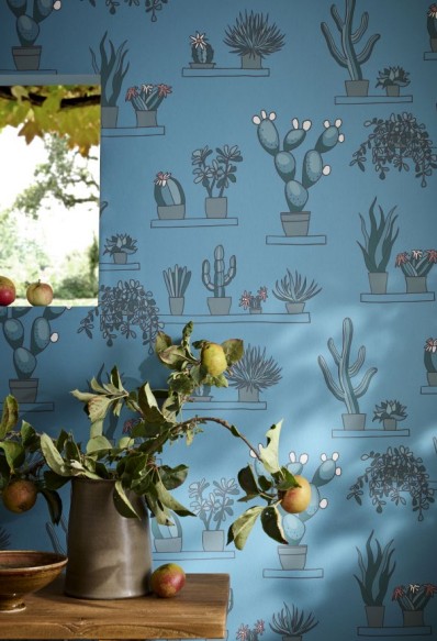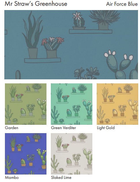 Het dessin ‘Mr Straw’s Greenhouse’ toont met charme geïllustreerde sculpturale vetplanten en bloeiende cactussen, gerangschikt op planken. Het ontwerp is verkrijgbaar in drie subtiele tonale kleurstellingen - Light Gold, Garden en Air Force Blue - en drie meer uitgesproken varianten, waarin de groene planten contrasteren tegen achtergronden van neutraal Slaked Lime en opvallend Green Verditer en Mambo.