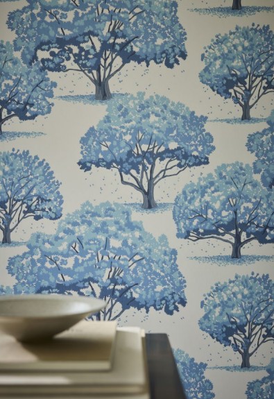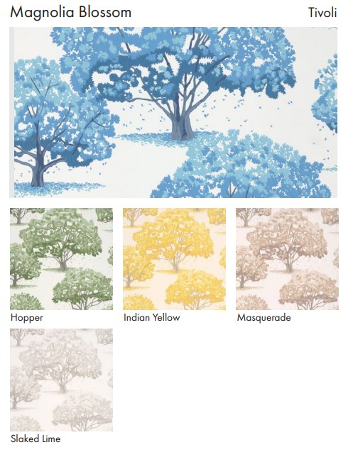 Magnolia’s, bekend om hun jaarlijkse geurige bloemen en kenmerkende zaaddozen, behoren tot de oudste boomsoorten ter wereld. Dit behang toont vier bijzondere magnolia’s uit tuinen beheerd door National Trust, waaronder Nymans in Sussex, Bodnant in Noord-Wales en de landgoederen Lanhydrock en Trengwainton in Cornwall. Het patroon verbeeldt een rustgevend bos van gestileerde, bloeiende magnolia’s, met volle kruinen overladen met zachte, verfijnde bloemen.