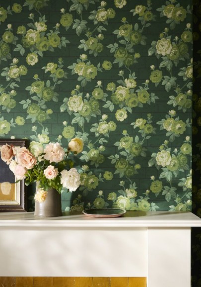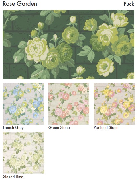 Het dessin toont weelderige, klimmende rozen in volle bloei tegen een achtergrond van neutraal natuursteen, of - in de kleurstelling Puck - een rijke, diepgroene tint. Hierdoor voelt het ontwerp zowel eigentijds als nostalgisch aan.