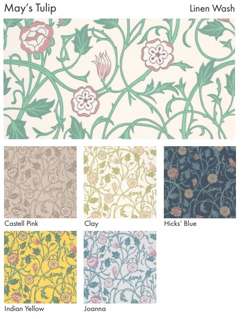 Het sierlijke dessin ‘May’s Tulip’ is geïnspireerd op een prachtig laat-19e-eeuws weefsel met weelderige tulpen, destijds verwerkt in panelen als scheiding tussen ruimten. Dit behang toont een vloeiend netwerk van verstrengelde ranken en sierlijke stelen, doorspekt met gestileerde bloemen en ontluikende knoppen die samen een ritmisch, harmonieus patroon vormen.