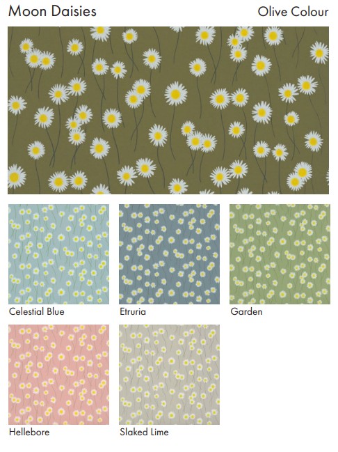 De ongeëvenaarde eenvoud van het madeliefje heeft al eeuwenlang kunstenaars en ontwerpers geïnspireerd, van borduurwerk en keramiek tot mode en behang. De naam van dit dessin verwijst naar de grote margriet (ox-eye daisy), die ’s nachts langs landwegen en paden het maanlicht lijkt te weerkaatsen. Het patroon toont madeliefjes met felgele, fluweelzachte bloemharten en in elkaar grijpende stelen - een veel eenvoudiger interpretatie dan het laat-19e-eeuwse behang uit Oxburgh Hall waarop het ontwerp is gebaseerd.