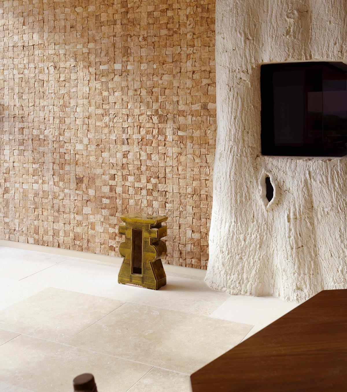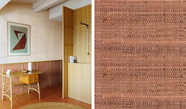 De dessins Alba en Rubra met moerbeiboomschors vullen de vertelling aan met elegante patronen die in de lijn liggen van een landschap als lappendeken. De bast van deze boom wordt in onregelmatige stroken verwerkt, handmatig ingelegd of geweven tot patronen die rust afwisselen met intensiteit. Denk aan een levendig, haast grafisch reliëf dat toch ingetogen blijft. Of aan grote, robuuste fragmenten schors die schitteren tegen een subtiel glanzende achtergrond, alsof ze met Kintsugi opnieuw tot leven zijn gebracht. De moerbeiboom vertaalt zich in wandbekleding die de ruimte niet alleen aankleedt, maar ook bezielt.