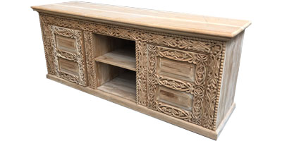 Met de handgemaakte kasten, schatkisten, tvmeubels van mangohout uit India met de mooiste oriëntaalse ronde vormen erin.