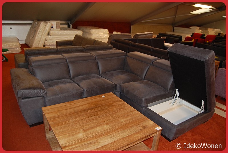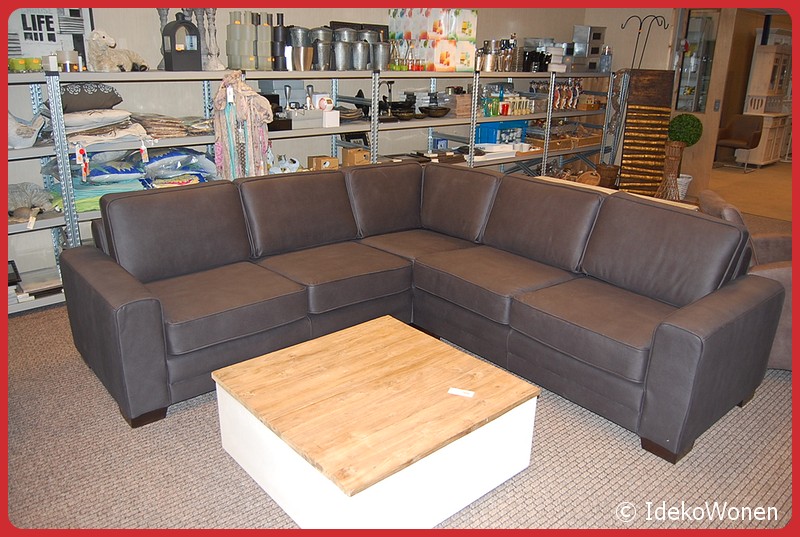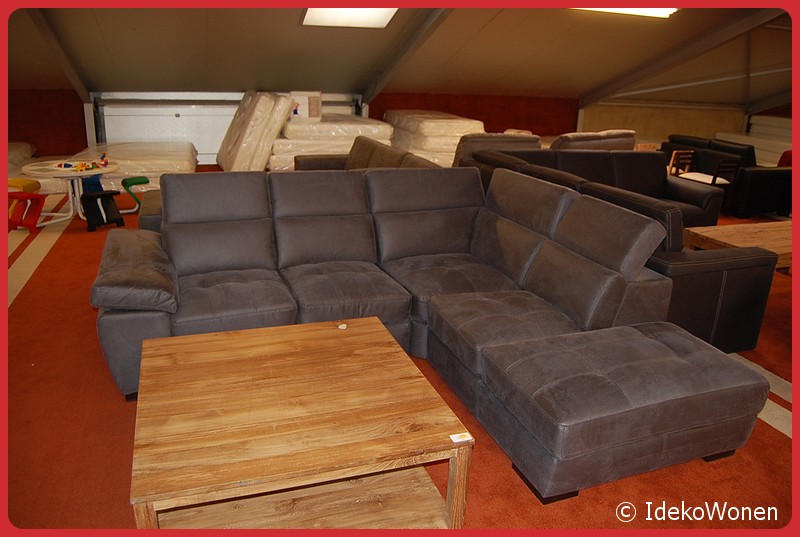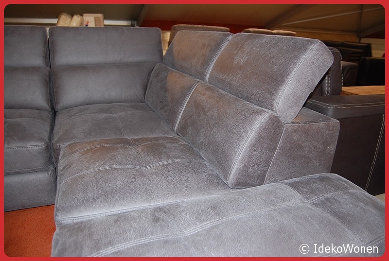 Hoekbank ”Nynke” R.VMateriaal: Stof & 60% leerKIeur: G-Ohio 801 Antraciet/GrijsAfmetingen: 262×235 cmEigenschappen: Vaste kussens, Koudschuimvulling, verstelbare hoofdsteunen, Opbergvak in chaiseVan: €2495