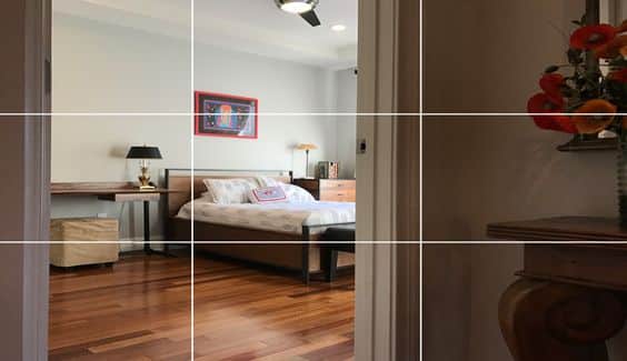 Als je je compositie hebt gekozen let dan ook op de horizontale en verticale lijnen in het beeld. Een scheve lijn kan namelijk erg storen. Probeer dus de lijnen van muren, tafels en andere meubels in de foto recht te krijgen, een raster kan daar ook bij helpen.Bij de meeste foto’s is het mooier om je focuspunt niet in het midden van het beeld te hebben. Kies bij voorkeur voor een focuspunt op een van de snijpunten, dat zorgt voor een spannender beeld.