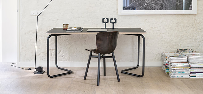 Kumpel combineert een robuust, eenvoudig schoon te maken blad van multiplex en linoleum met stalen schragen. Elke schraag bestaat uit een enkele gebogen stalen buis waarvan de uiteinden zorgvuldig aan elkaar gelast zijn. Het resultaat: een onafgebroken, vloeiende vorm die veel meer beenruimte biedt dan een standaard schraag.