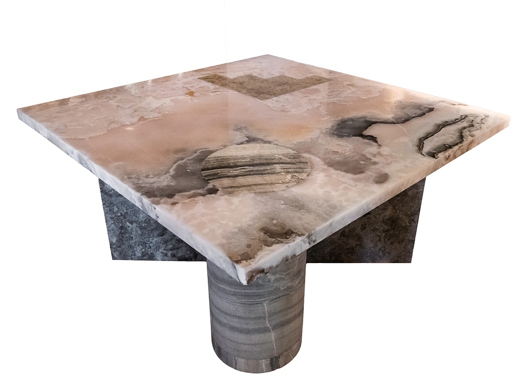 De twee rechthoekige poten zijn gemaakt van gepolijst marmer Ocean Grey Marble. Het blad is gemaakt van een bijzondere plaat Pink Onyx. De afwerking is ‘gehoned’. In het blad z?n twee uitsparingen gemaakt met behulp van een waterjet voor de inlaat van travertin en onyx.