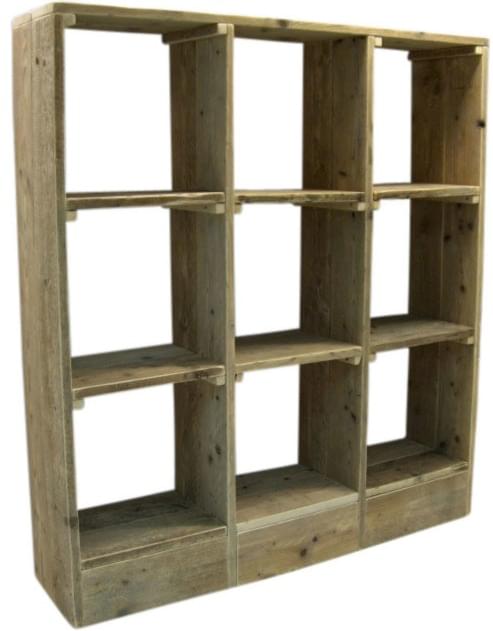 Deze negen vaks steigerhouten vakkenkast van Jorg is ideaal voor het presenteren van spullen als boeken, mooie vazen, fotolijstjes en nog veel meer.