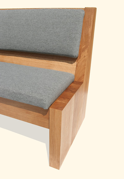 Deze Oostenrijkse eethoek, in massief eiken, is uitgevoerd met een gestoffeerde rug. Dit model: Gerlos kan gemaakt worden in 7 cm of 3,5 cm dik hout.