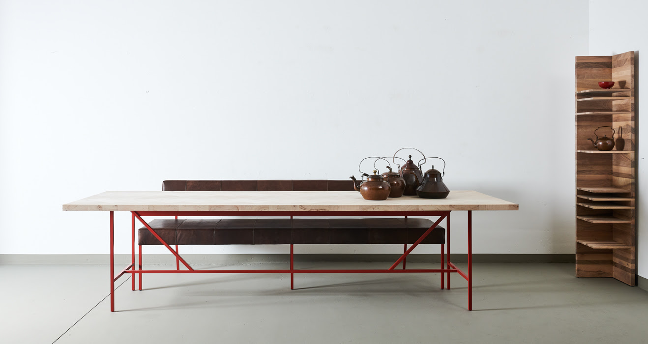 Een ranke verschijning, het stalen frame is massief. Het draagt het tafelblad met visgraatmotief.