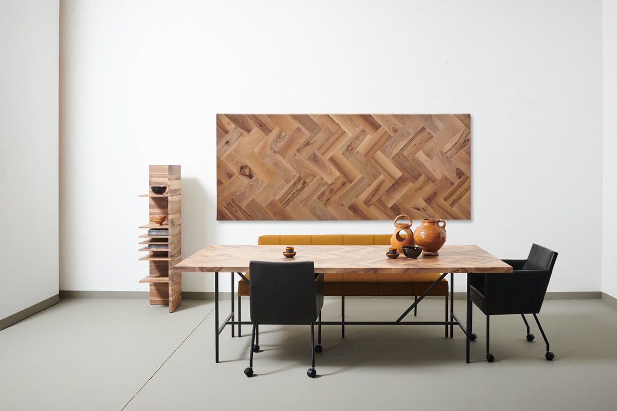 De Famylje Collection wordt in 2019 uitgebreid met nieuwe eettafel genaamd Brugt, gestoffeerde eetbank Marjelle, fauteuil Ludy en salontafels Jacoba.