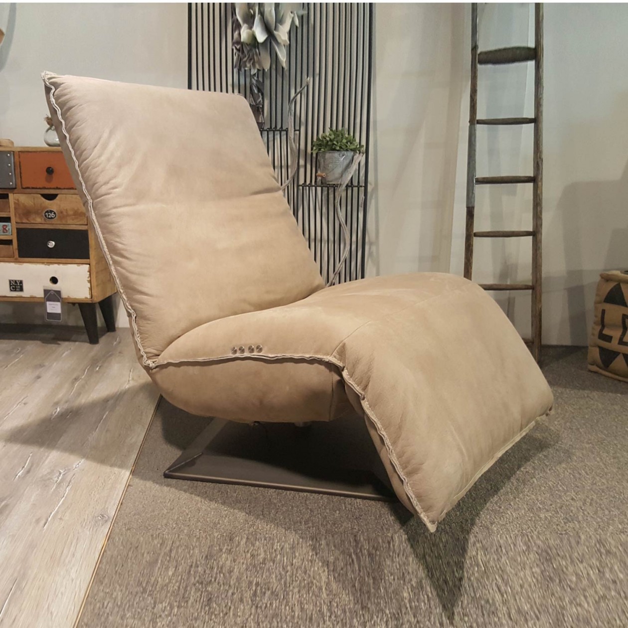 De relaxfauteuil Indi is een echte stoere relaxfauteuil....een echte blikvanger! Verkrijgbaar in leer of stof