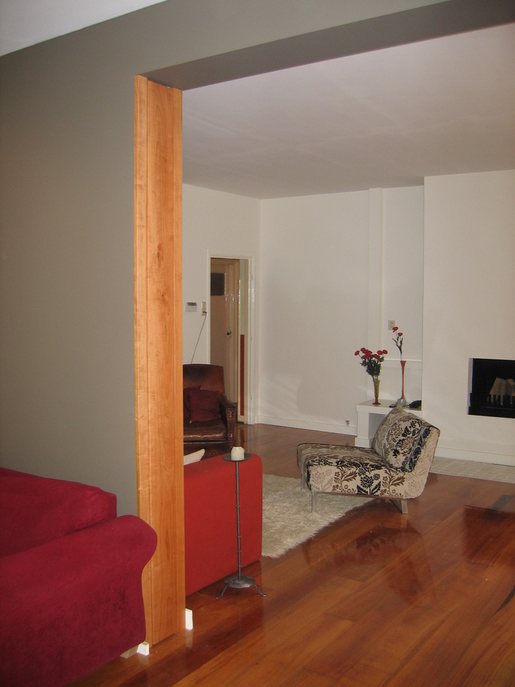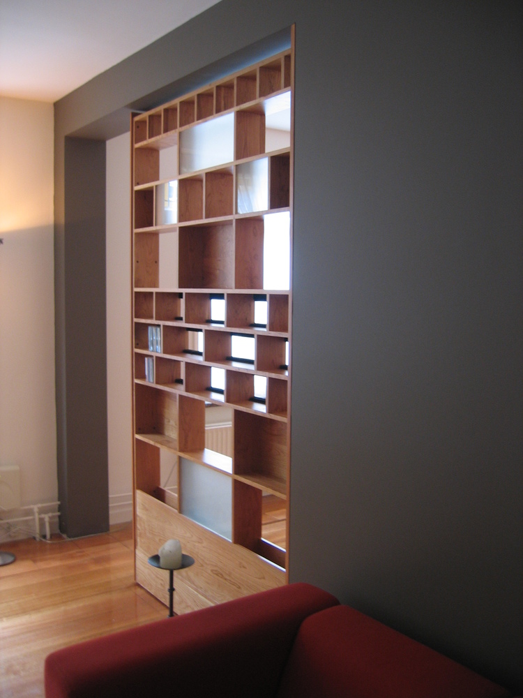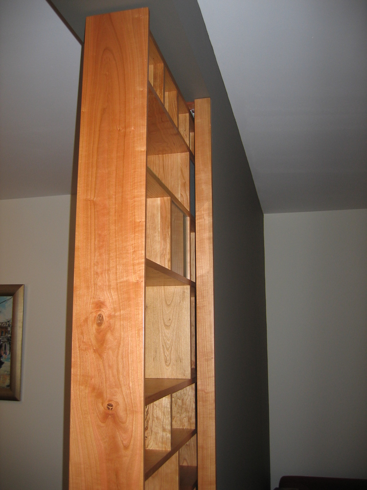 Volledig uittrekbare wandkast, voor cd’s en boeken, in massief amerikaans kersenhout. De kast verdwijnt in gesloten toestand geheel in een smalle opening in de scheidingsmuur tussen de twee kamers. Door licht tegen de voorzijde te drukken schuift de kast naar buiten.