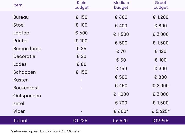 We hebben de gemiddelde prijs onderzocht voor het verbouwen van een thuiskantoor. Er zijn drie budgettypes die we hebben onderzocht, beginnend met alleen de basisitems zoals een bureau en stoel, tot de meer decoratieve verbeteringen met hogere prijskaartjes.