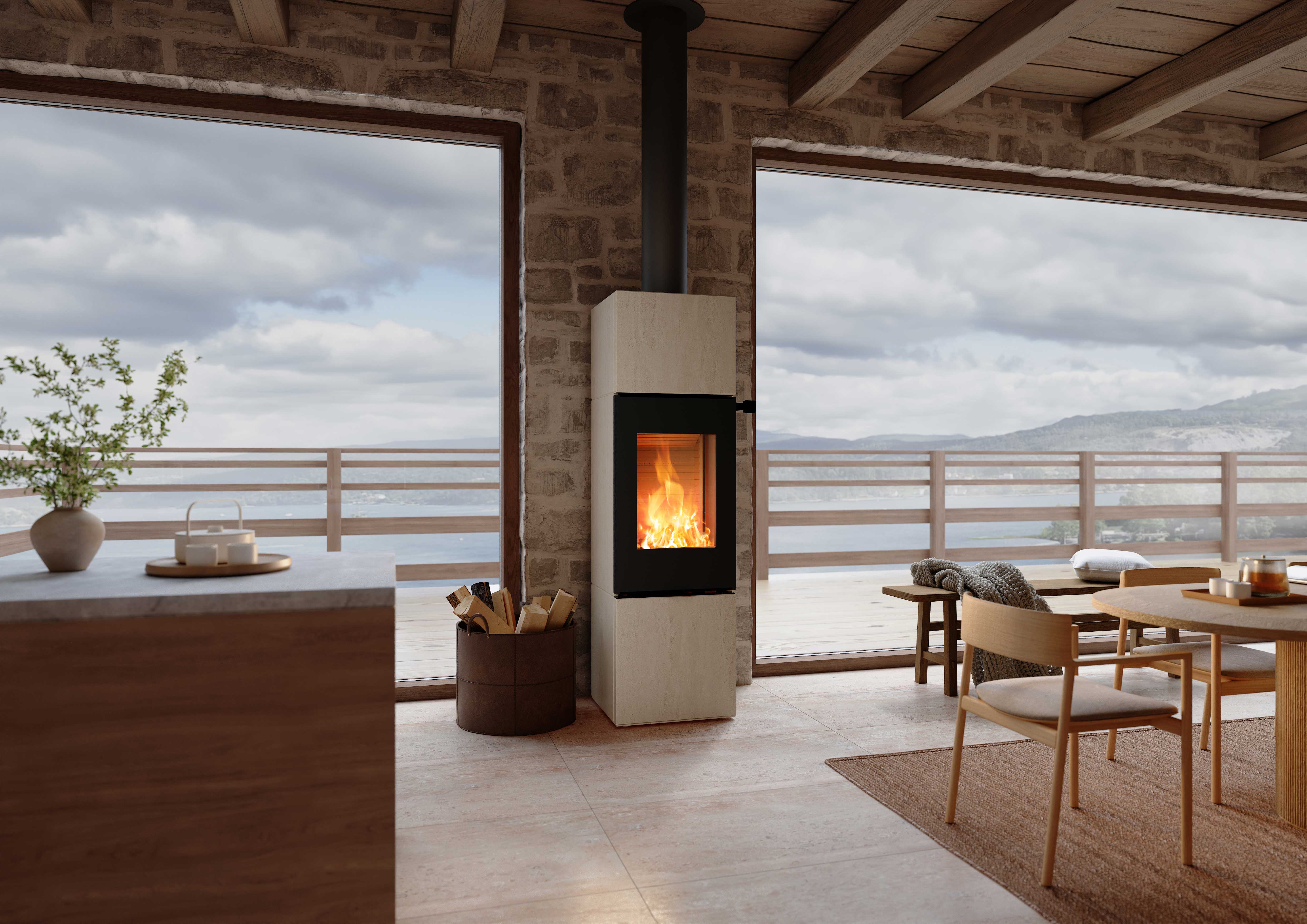 De lichte steenbekleding geeft de kachel een hoogwaardige, natuurlijke uitstraling en dient tevens als efficiënte warmteaccumulator. Zelfs nadat het vuur is gedoofd, blijft de natuursteen de opgeslagen warmte nog urenlang gelijkmatig afgeven aan de ruimte. De aangename stralingswarmte maakt het zitten bij het vuur nog aangenamer. Voor nog meer warmteopslag kan een optionele warmteopslagmodule© worden geïnstalleerd.