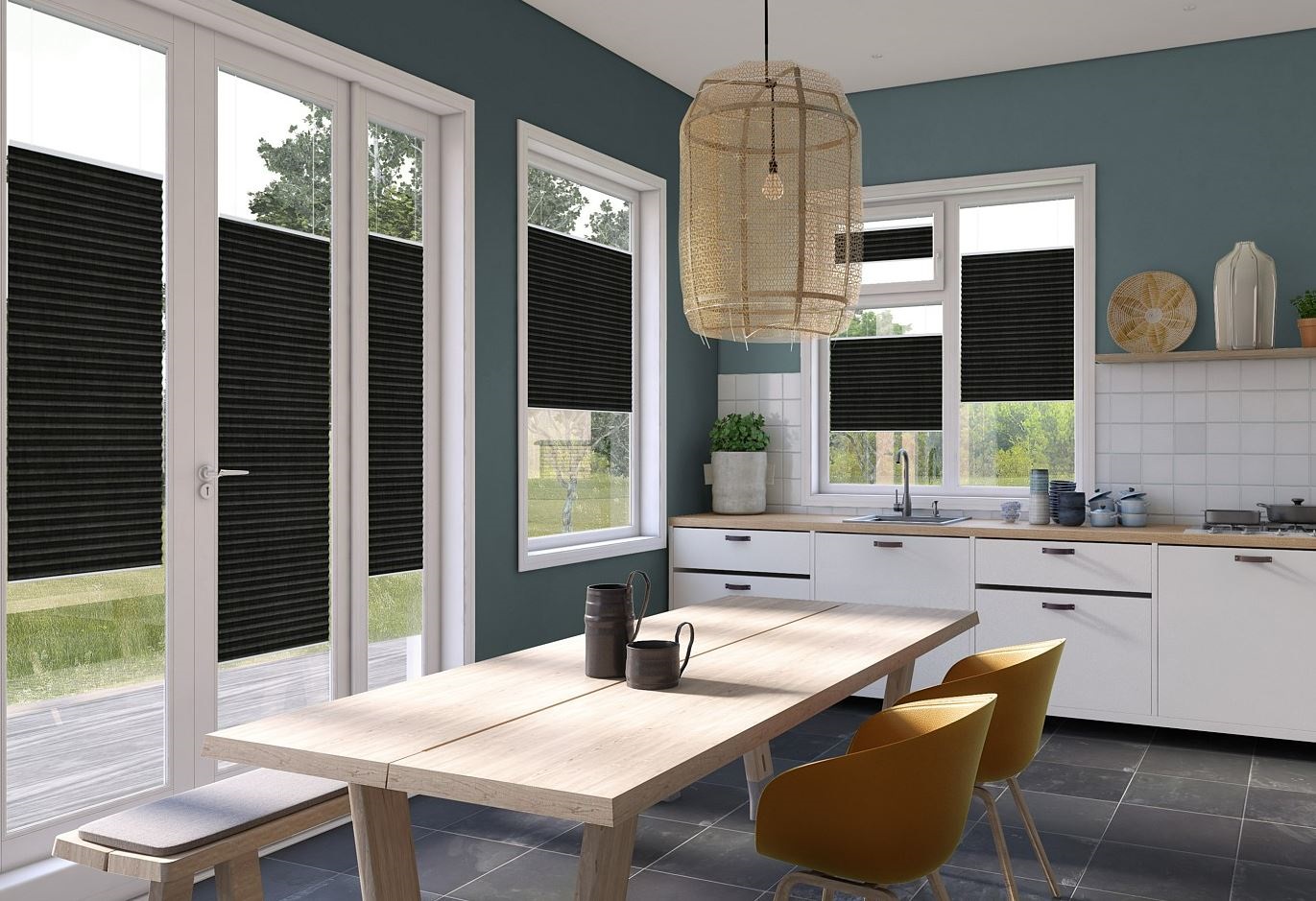 Plisségordijnen en honingraat plisségordijnen met top-down bottom-up bediening met handgreep zijn perfect voor draai/kiepramen. Deze stijlvolle gordijnen hebben standaard een ingespannen systeem, dus het gordijn klappert niet en blijft netjes op zijn plaats.