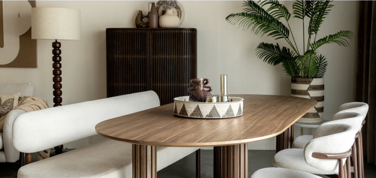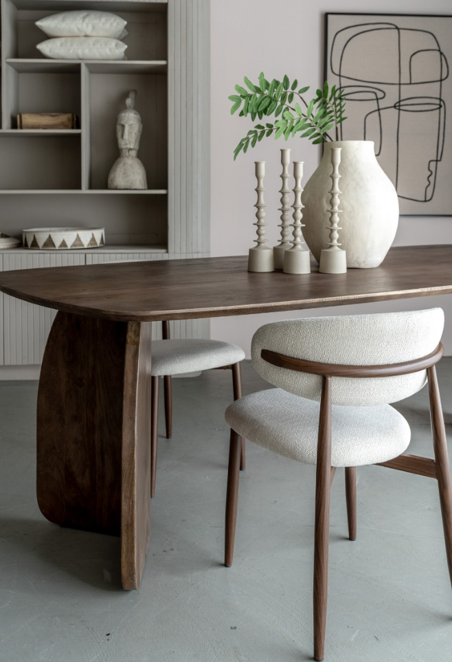 Een ander trendy meubelstuk in de Japandi collectie is de houten salontafel met organische vormen. De zachte, afgeronde contouren voegen een subtiel speels element toe aan de ruimte, zonder afbreuk te doen aan de minimalistische esthetiek van de Japandi stijl.