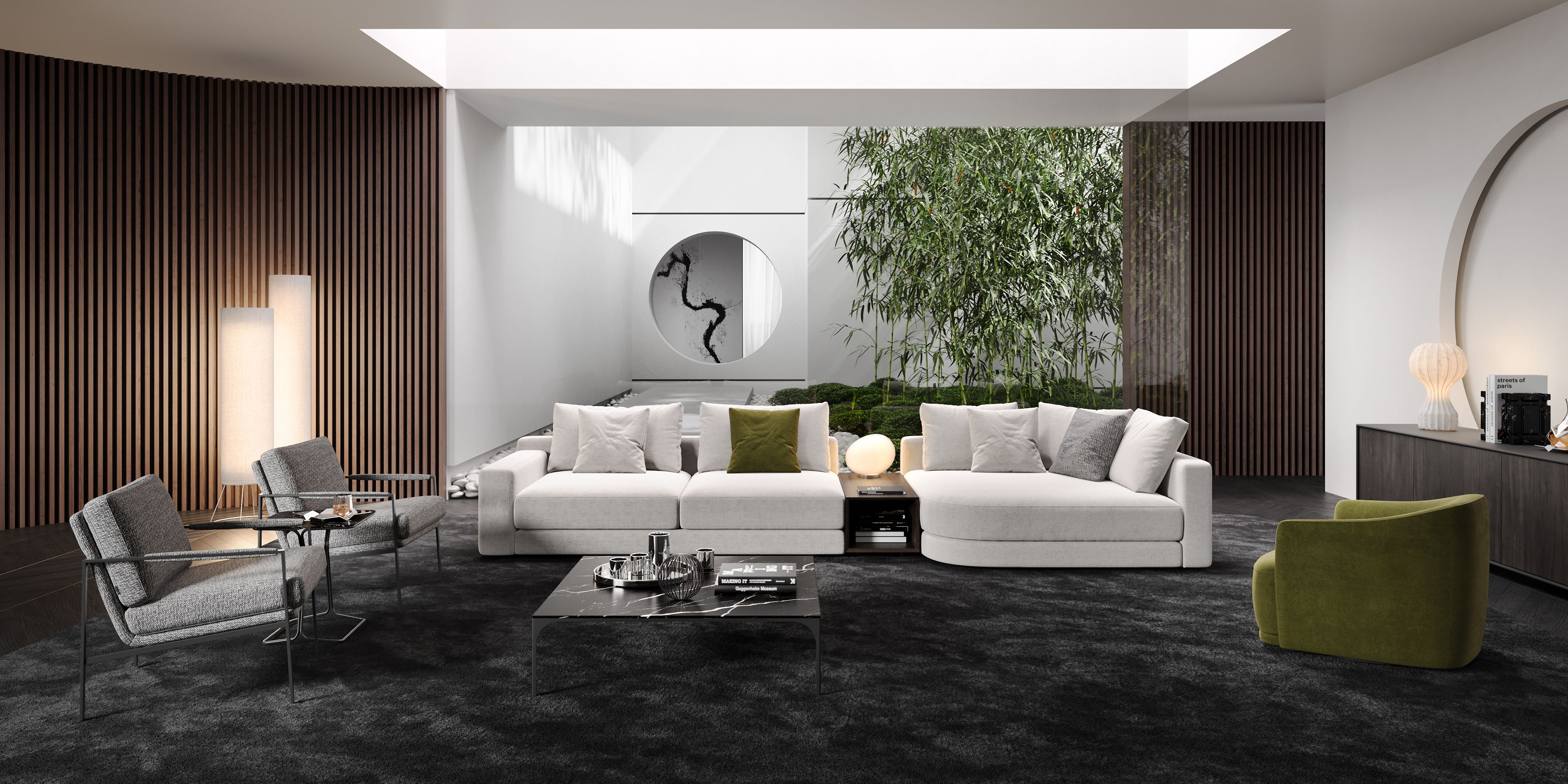 Deze design hoekbank is met zijn lage profiel en diepe kussens een onbetwistbare novelty in de wereld van wonen en interieur. Hij heeft een zeer gastvrije uitstraling en biedt ultiem zitcomfort.
