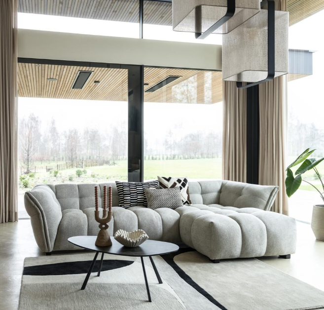 Voor wie vaak gasten ontvangt, is een u-vormige opstelling ideaal. De zitplaatsen die de ruimte omarmen zorgen voor een warme en uitnodigende sfeer. Voeg wat sierkussens in verschillende stoffen en kleuren toe om de zithoek nog gezelliger te maken. Een groot vloerkleed onder de bank zorgt ervoor dat de ruimte visueel één geheel wordt en biedt extra comfort.