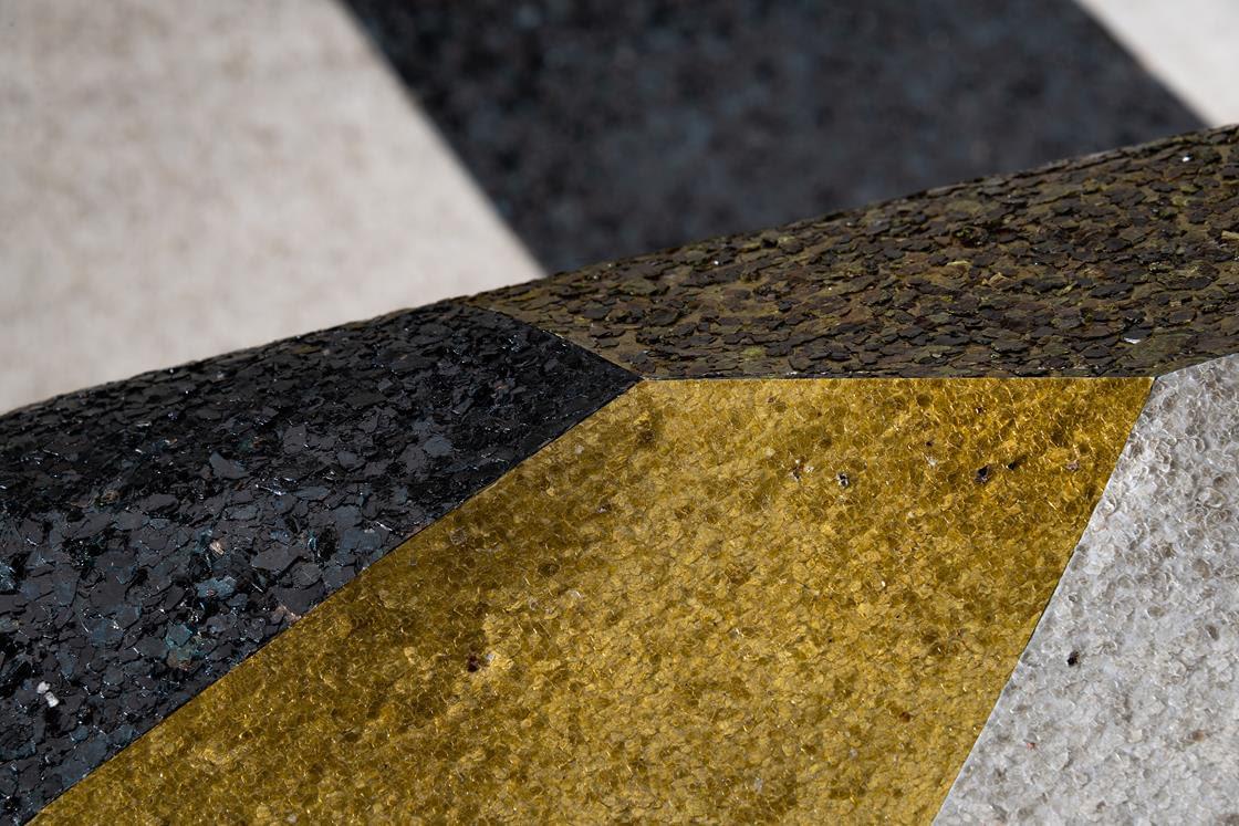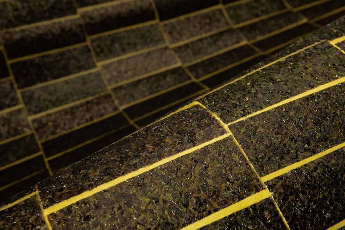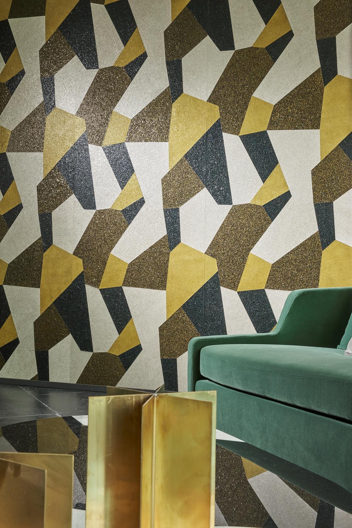 Fraction is de blikvanger van de collectie. Het dessin is gemaakt van micaschilfers. Ze worden met de hand gekleurd, gestanst en zorgvuldig ingelegd in een herhalend patroon. Het dessin is een moderne interpretatie van de kleurrijke, klassieke terrazzovloeren.