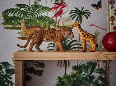 Dit ultrahippe palmbehang past helemaal in de huidige tropische modetrend. Het is een prachtig en zeer veelzijdig design en het echte drama ontstaat door de donkere kleuren of meer subtiele effecten met de neutrale kleuren. De glitterachtergrond en metallic versieringen op de bladeren maken dit design speciaal. Dit behang dat een statement maakt met palmgroen, wit en metallic ziet er fabulous uit op alle vier de muren. Het vliesbehang heeft de innovatieve ‘paste-the-wall’-technologie, de muur wordt met lijm ingesmeerd in plaats van het behang waardoor het behang veel makkelijker op te hangen en te verwijderen is. Je bent dus minder tijd kwijt met decoreren. Prijs: € 30,-.